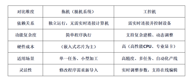 在精雕機(jī)(CNC雕刻機(jī))系統(tǒng)中,拖機(jī)(脫機(jī))和工控機(jī)是兩個(gè)不同的概念,它們?cè)诠δ芎蛻?yīng)用場(chǎng)景上有著顯著區(qū)別。以下是兩者的核心差異及具體說(shuō)明:
